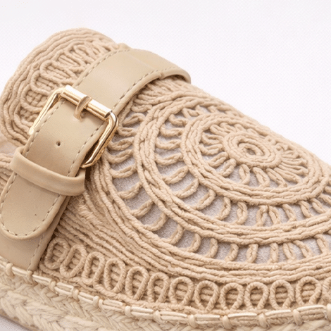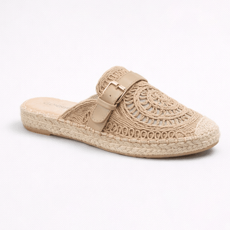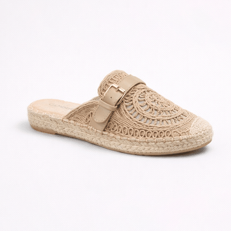 Mules estilo espadrille en tono beige con diseño trenzado y detalle de hebilla. Cómodos, elegantes y perfectos para el verano.